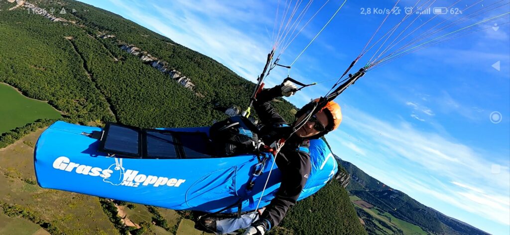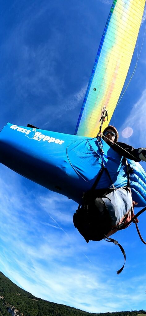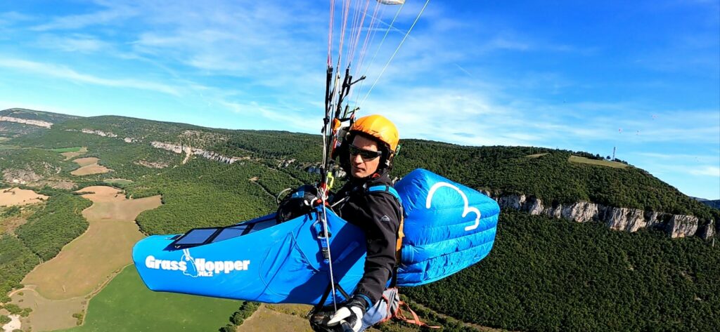 Les essais en vol à la Puncho avec le sac à dos harnaché sous le parapente, des modifications à la machine à coudre ont été nécessaires pour fixer le sac à la sellette, merci à ma Pfaff 128.6 !