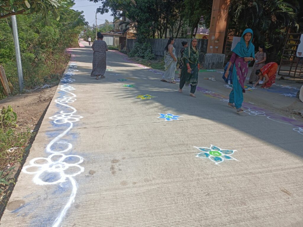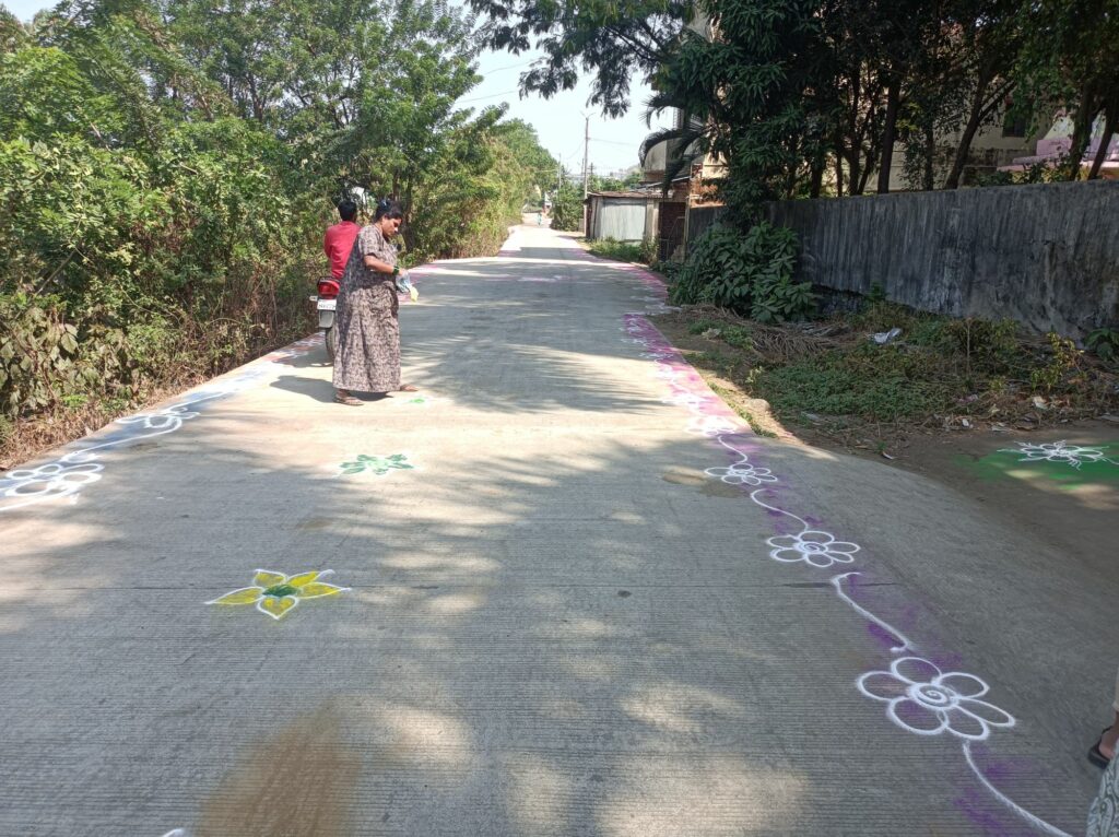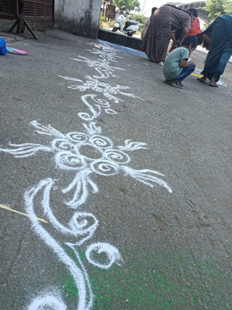 Décorations religieuses dans la rue, amener les dieux de la prospérité à emprunter cette rue bien embellie par les dessins à base de craie.